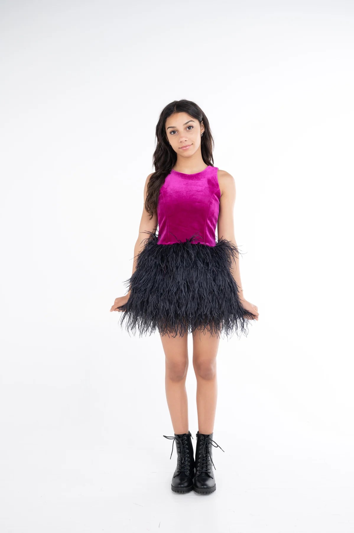 - Zoe "Quinn" dress with velvet bodice and Ombre feathers